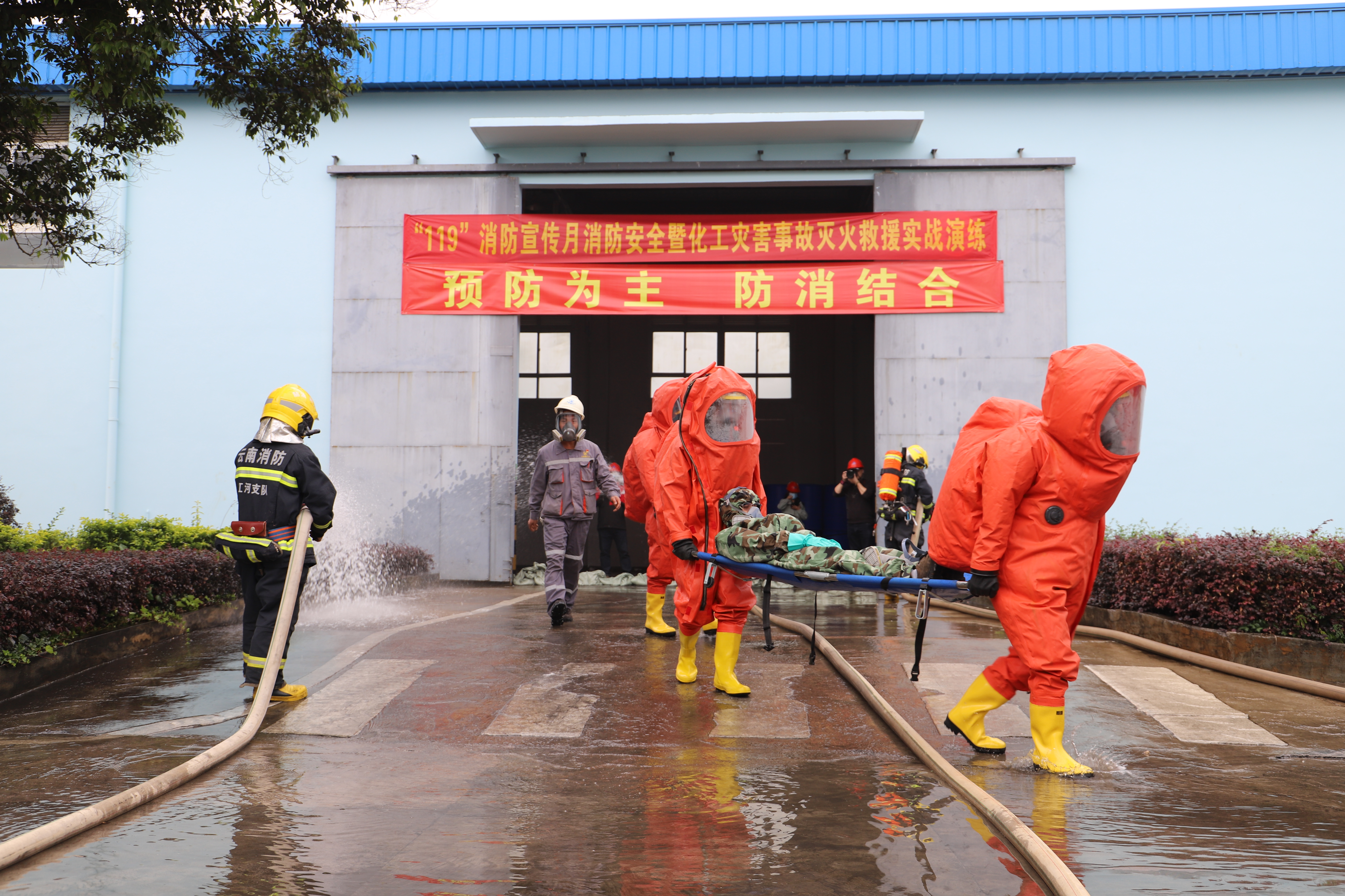 當天下午14:00,現場模擬硫醇甲基錫儲存倉庫起火。車間迅速組織人員疏散,向云錫應急救援隊和大屯消防救援站報警,云錫消防隊兩輛消防車先到達現場組織初期火災撲救;大屯消防救援站到達現場,迅速現場警戒及疏散,用水槍堵截外圍火勢,掩護救助被困人員;金湖消防救援站增援力量趕到,迅速組織主戰車和高噴車采取“東西夾擊”對倉庫滅火進攻。最終,解救出3名被困人員,火勢成功撲滅,實戰演練達到了預期效果。